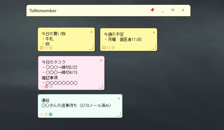 デスクトップ上に常時展開して思いついたこと、忘れそうなことを付箋にメモするイメージで残して置けるようにするためのアプリです。